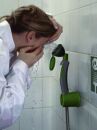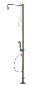 Notdusche freistehend mit Becken und Deckel,mit Au gennotdusche,2 Sprühköpfe, Verrohrung u Ventile Ed elstahl